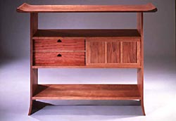 "Моя карьера началась очень стандартно", - говорит он, - "поначалу я изготовлял довольно обычные кухни и кабинеты, но однажды, в середине 70-х, я оказался на выставке в Балтиморе, и тогда понял, что мебель может быть гораздо большим, чем просто профессией - это настоящее искусство, по выразительности ничем не уступающее поэзии, нужно только уметь его понимать. Конечно, это справедливо только для ограниченного числа серьезных мастеров, и если ты хочешь оказаться в их числе, надо полностью сосредоточиться на штучных заказах, тиражированная вещь уже не может быть произведением искусства".